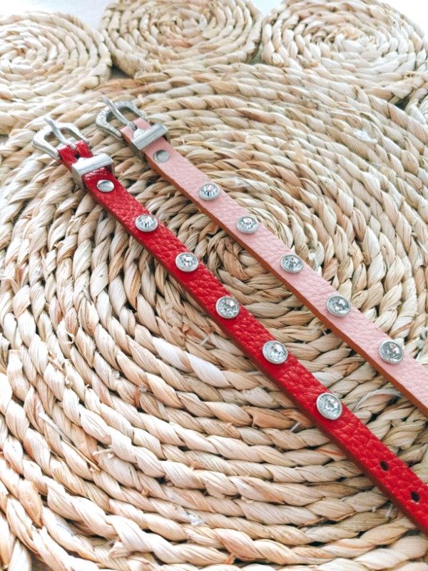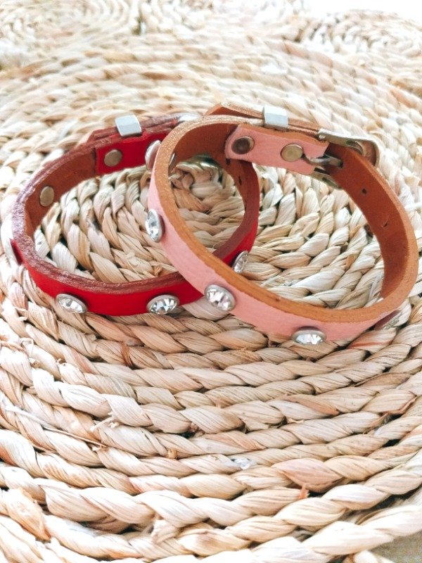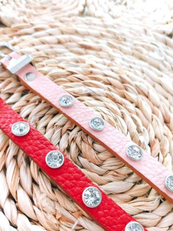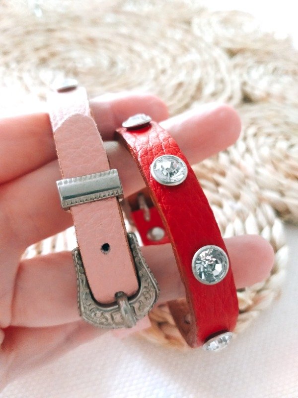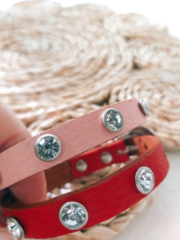 Pulsera de cuero de 1 cm de ancho con apliques de strass y cierre calado color níquel