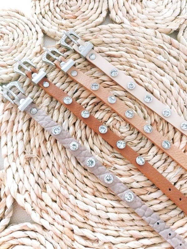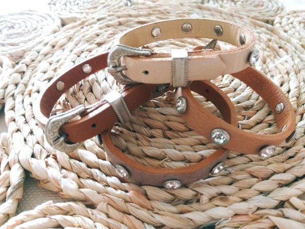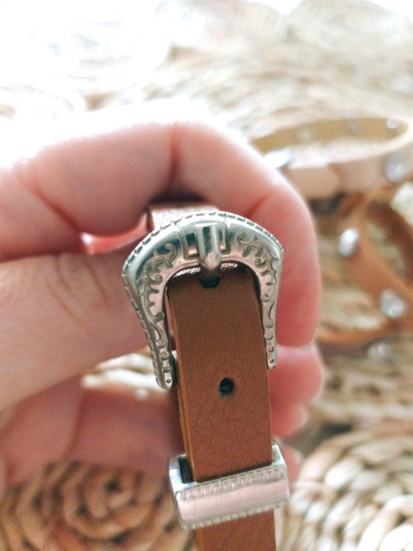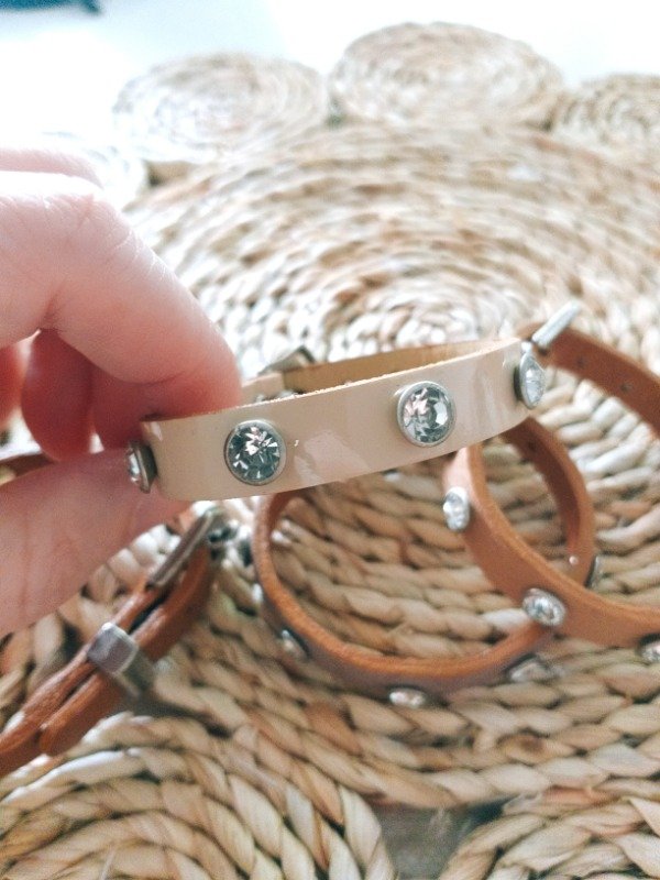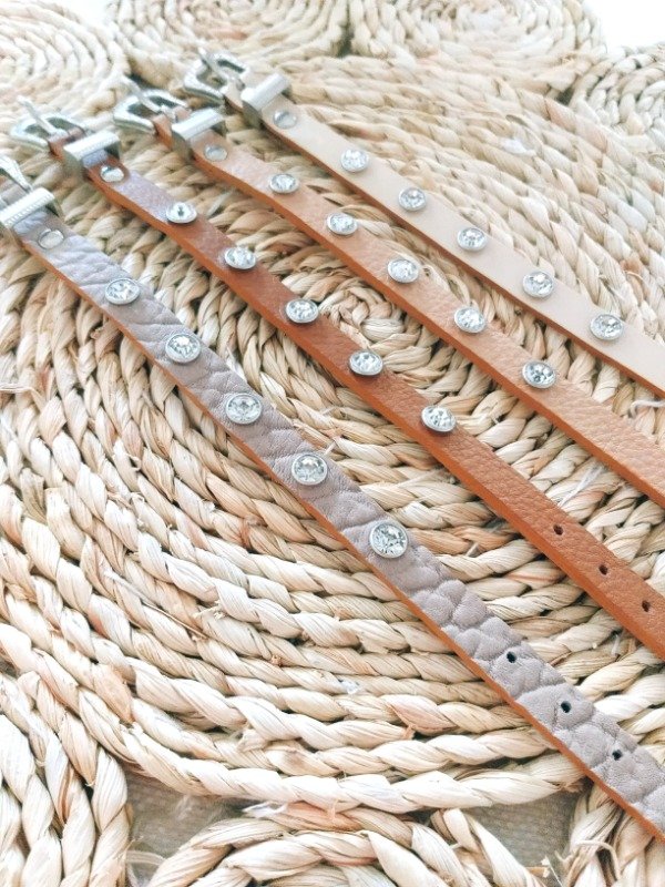 Pulsera de cuero de 1 cm de ancho con apliques de strass y cierre calado color níquel