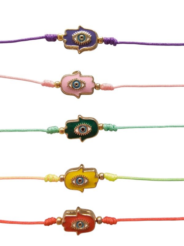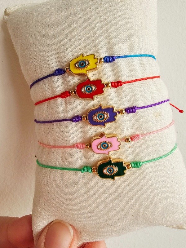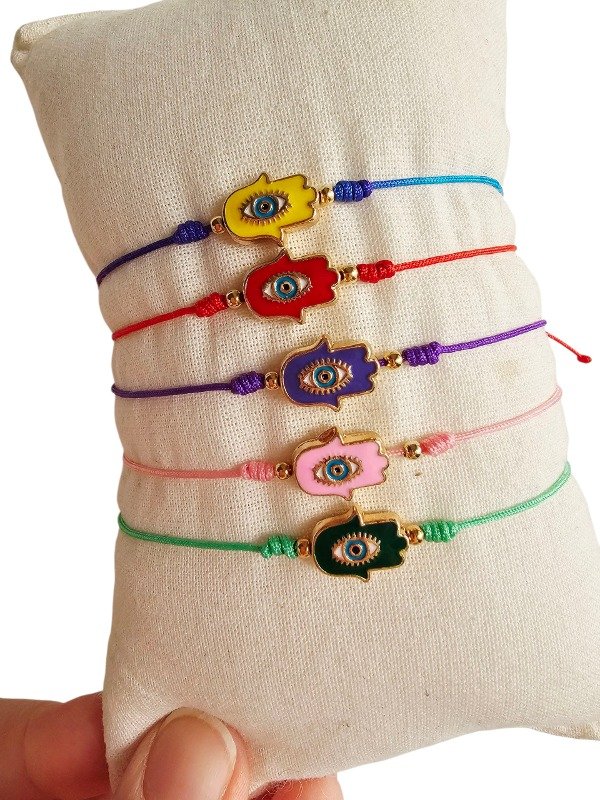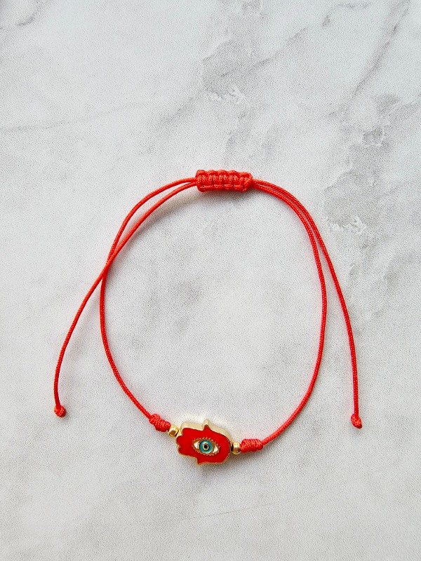 Pulsera de hilo chino regulable con dije esmaltado, pelotitas de oro laminado y nudo barril