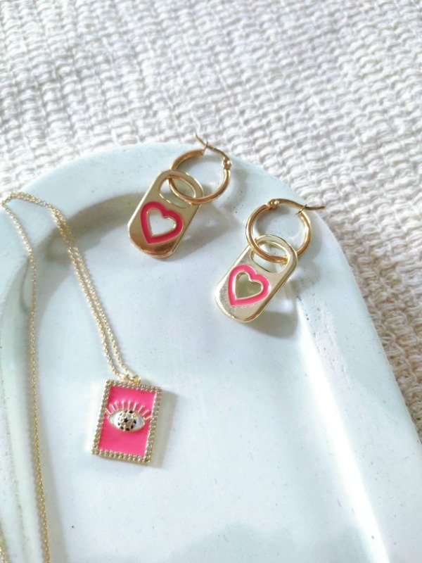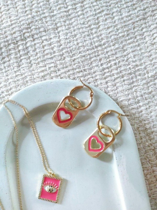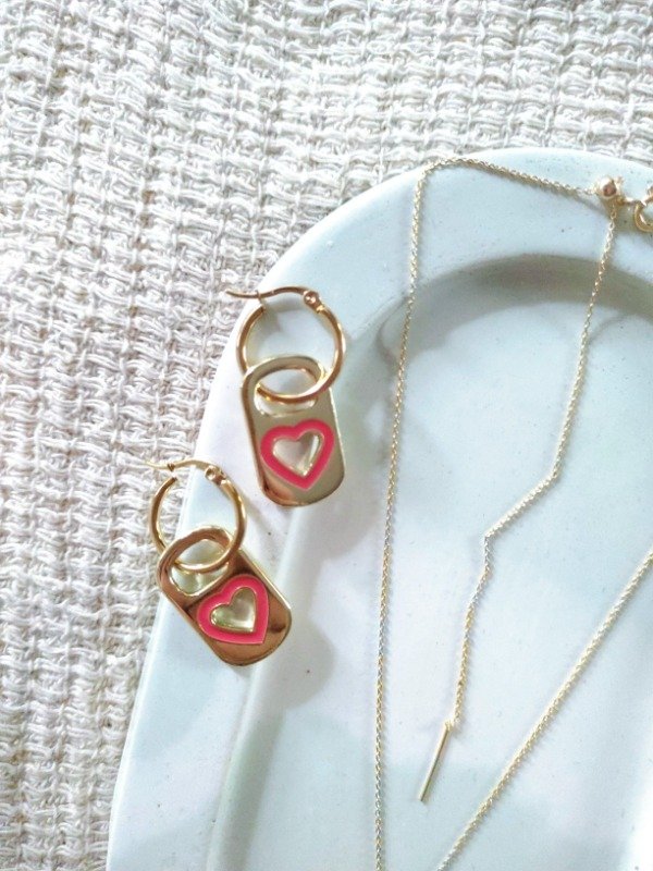 Argollas de acero dorado de 19 mm de diámetro con dije de chapita de soda con corazón calado y esmaltado