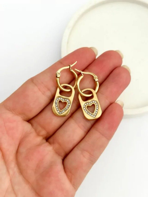 Argollas de acero dorado con dije de chapita de gaseosa con micro zirconias