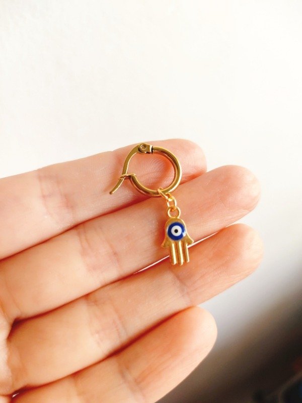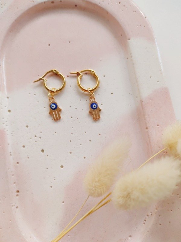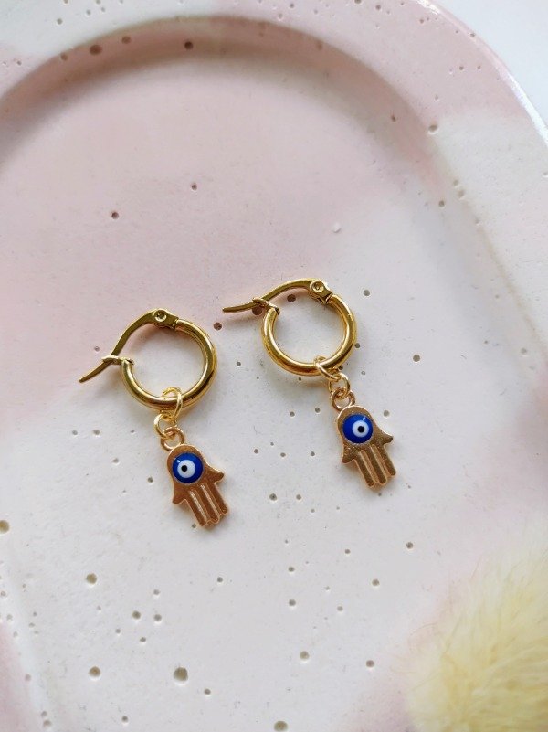 Argollitas de acero dorado con dije de mano de hamsa y ojo turco de fundición esmaltada