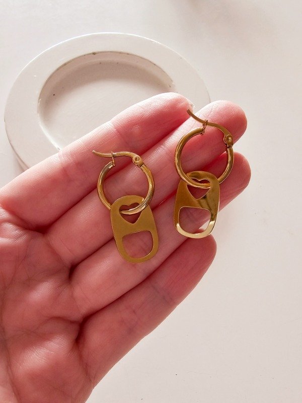 Argollas de acero dorado con dije de chapita de gaseosa con corazón calado