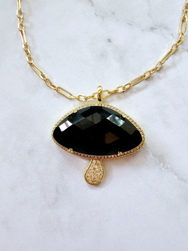 Este collar con cadena de oro laminado cuenta con un impresionante dije de piedra natural obsidiana y delicados circones, todo en oro laminado. La medida del dije es de 3,5 cm, lo que lo convierte en una pieza llamativa y sofisticada.