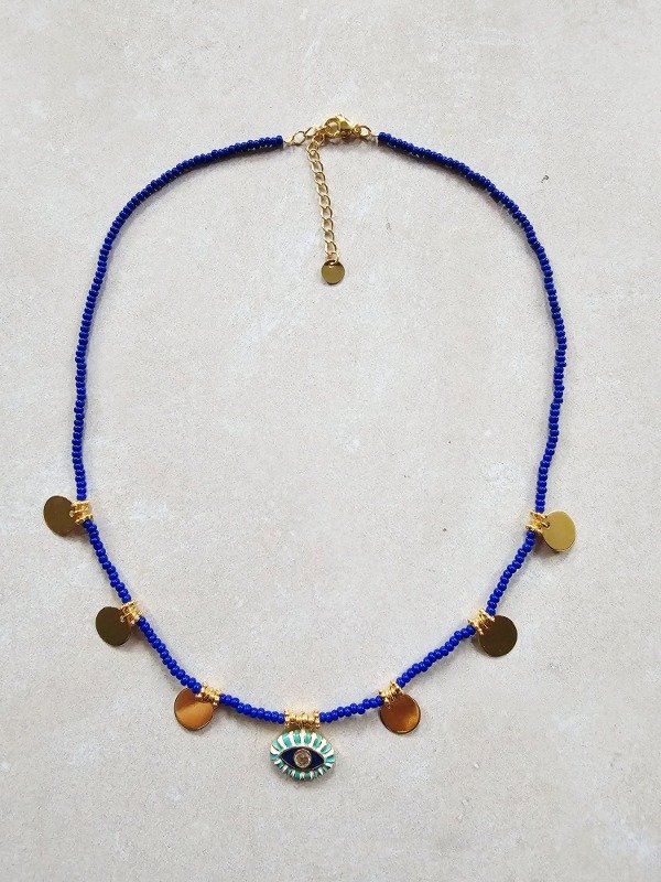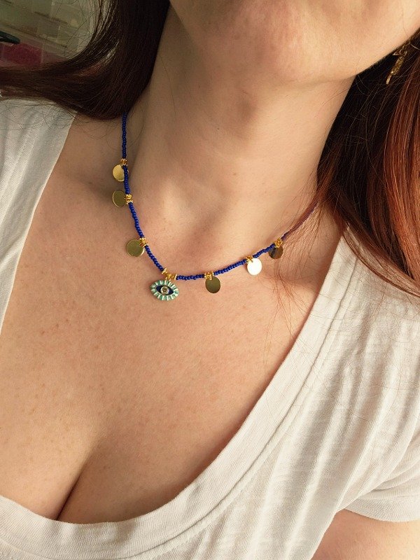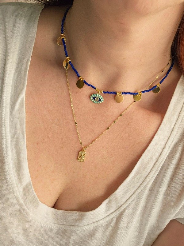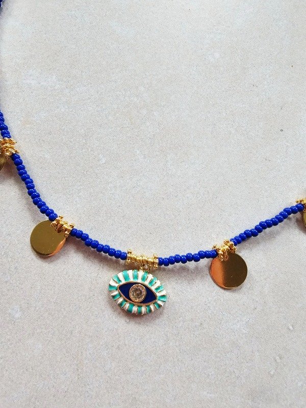 Descubrí el encanto del Collar Blue Nazar, una joya que combina un delicado dije de ojo turco esmaltado con una circonia en el centro, acompañada por dijes de chapitas circulares a los costados y mostacillas checas calibradas que realzan su diseño único.