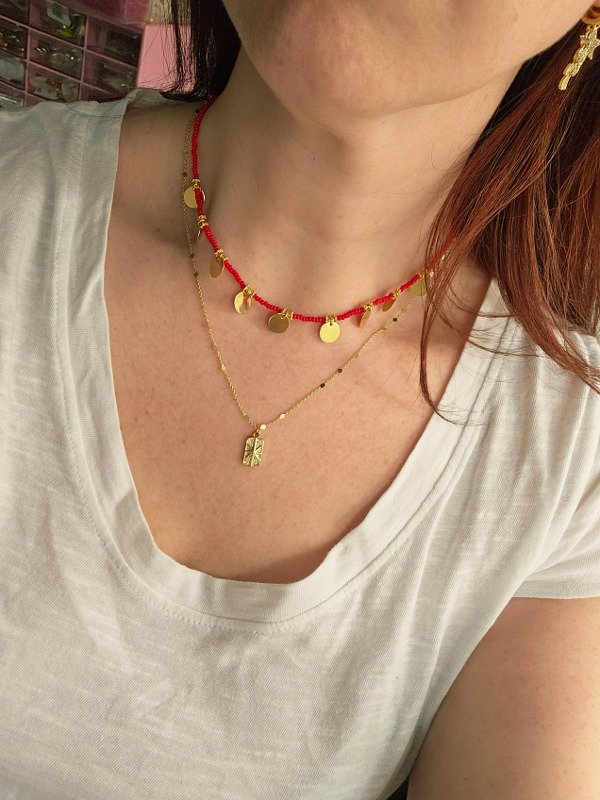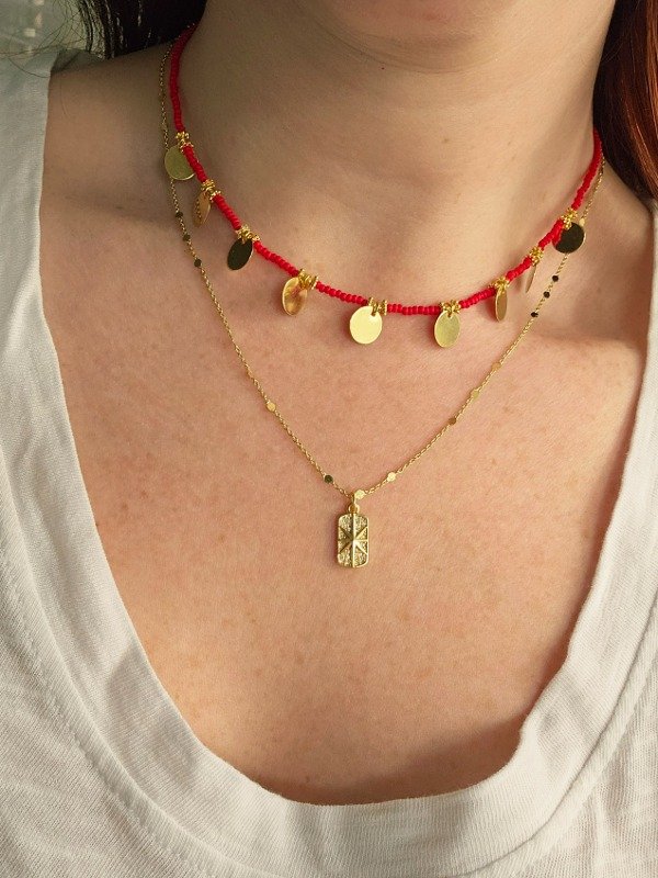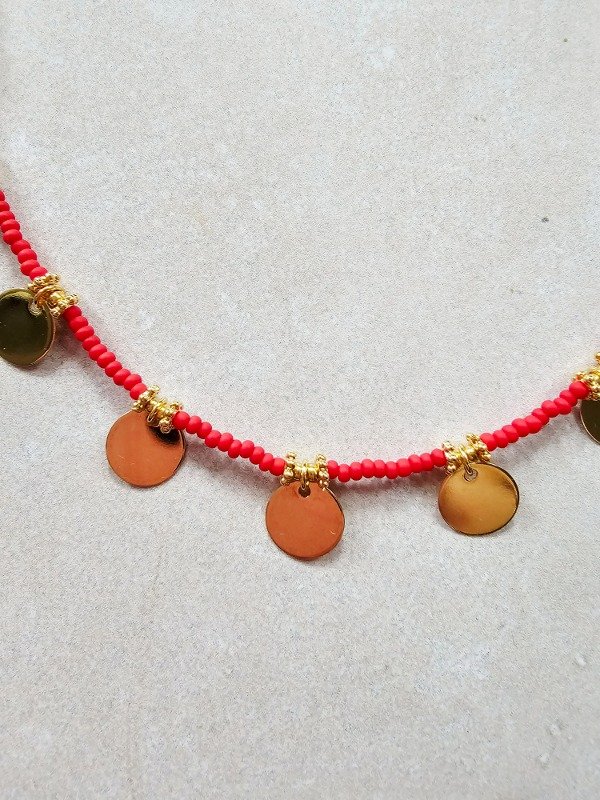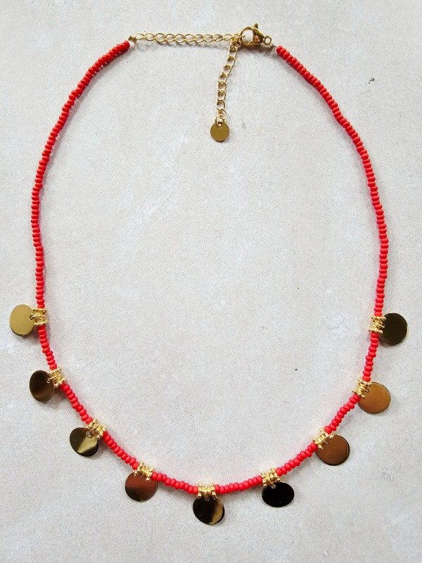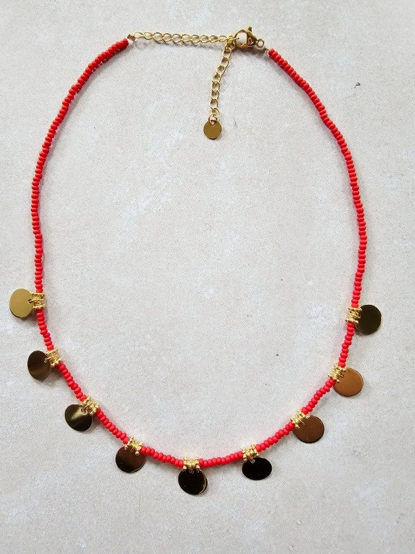 Descubrí el Collar Olivia, una joya enhebrada con mostacillas calibradas rojas y dijes circulares planos en oro laminado. Su diseño delicado y elegante aporta un toque de color y sofisticación a tu estilo.