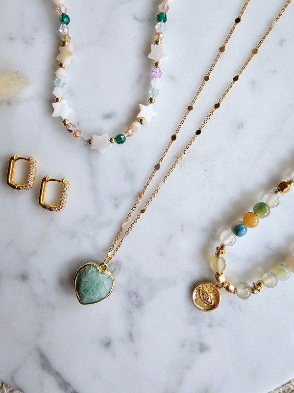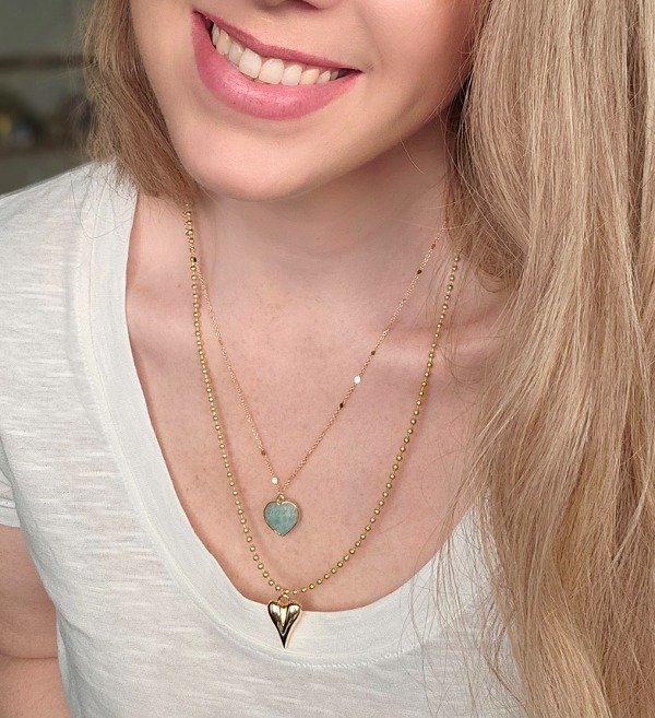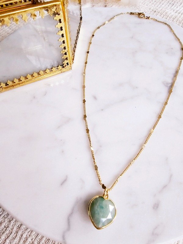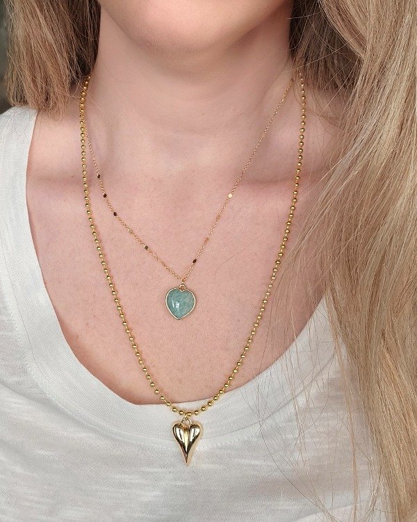 Collar con cadena de oro laminado y corazones intercalados con dije de corazón en piedra natural de amazonita