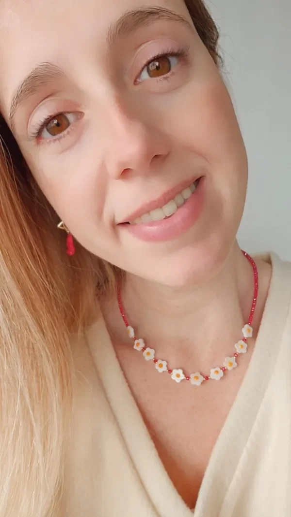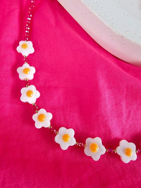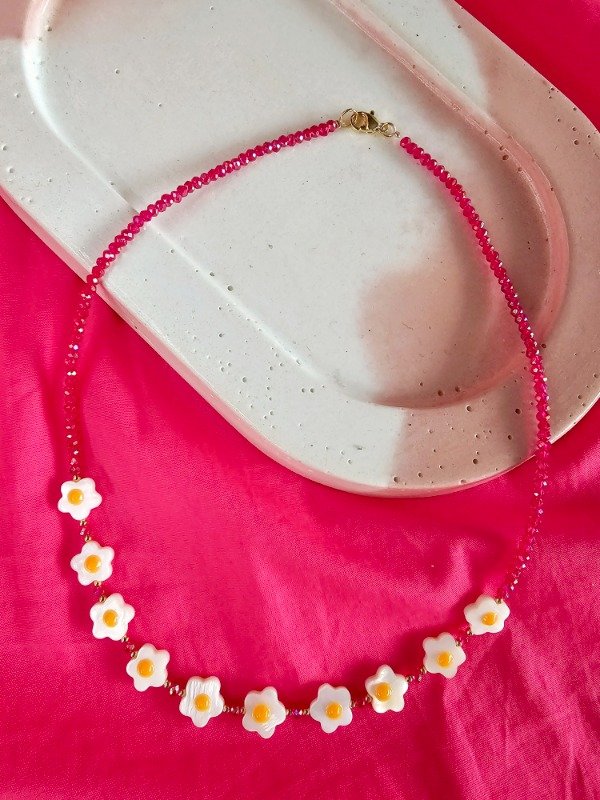 Collar con margaritas de nácar, cristal de roca y fornituras de oro laminado