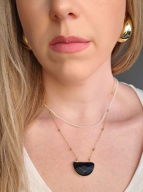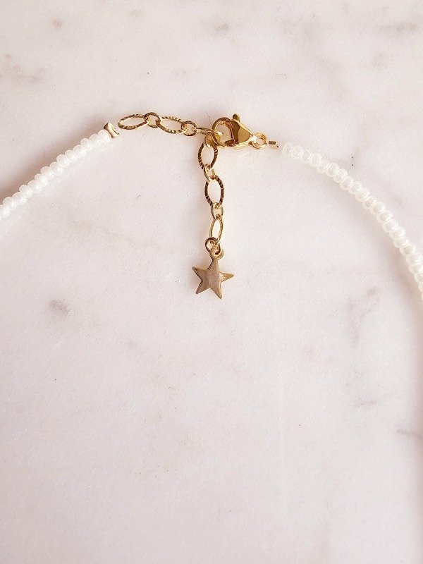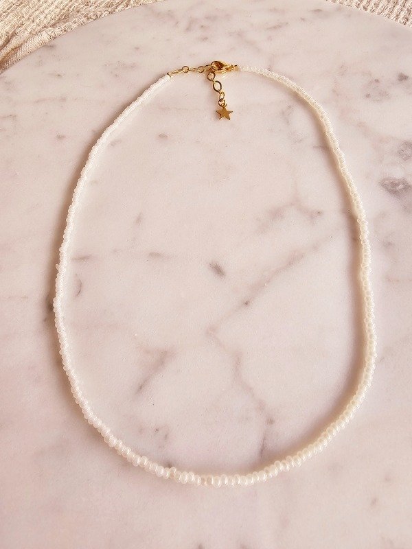 Collar de mostacillas checas calibradas blancas perladas con fornituras de oro laminado