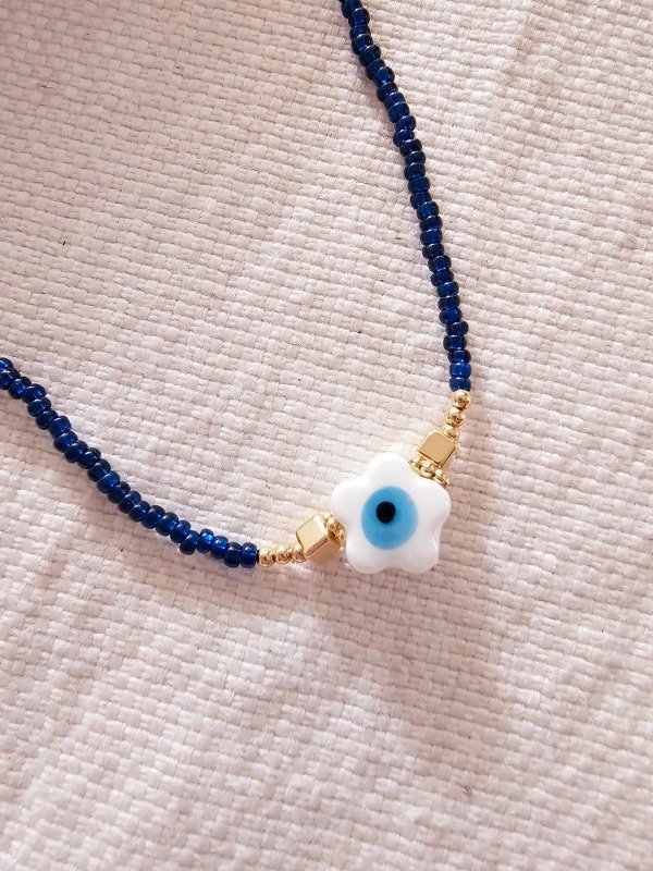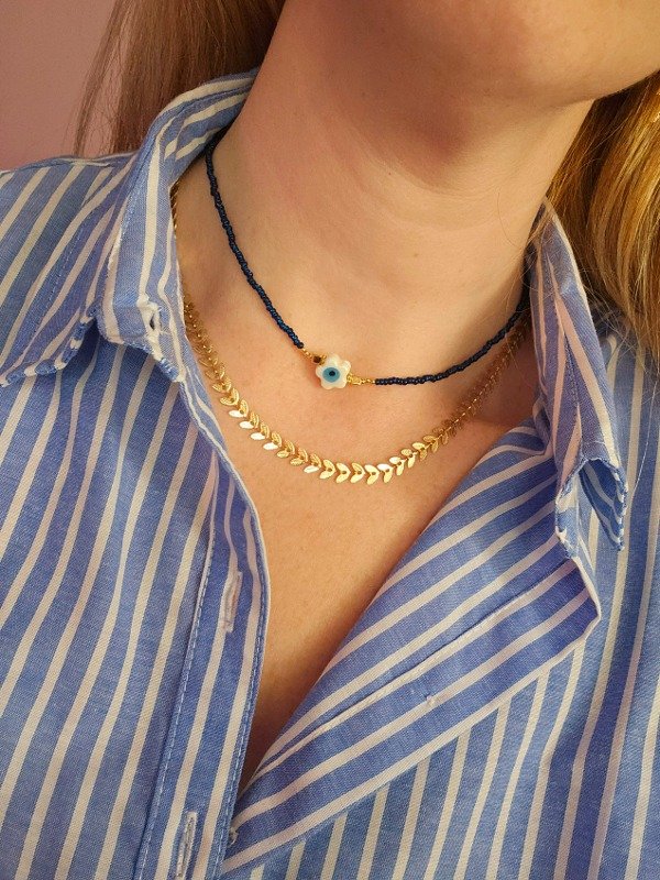 Medida 40 cm, este collar fue pensado para usarlo a la base del cuello y hacer layering con otros collares