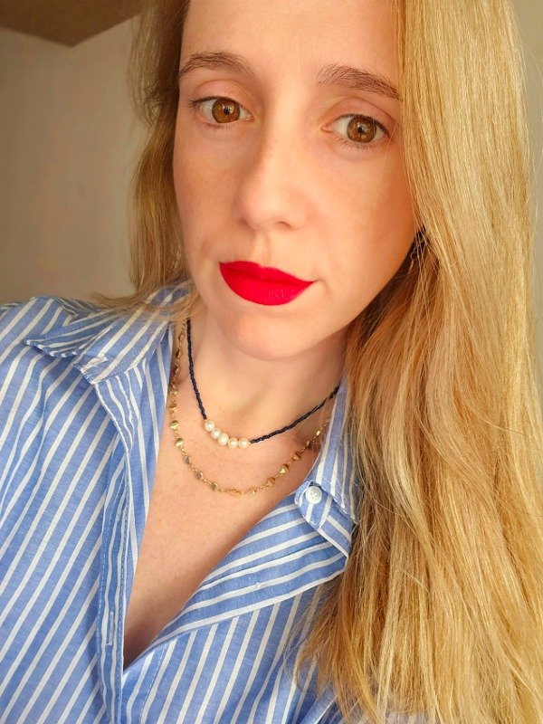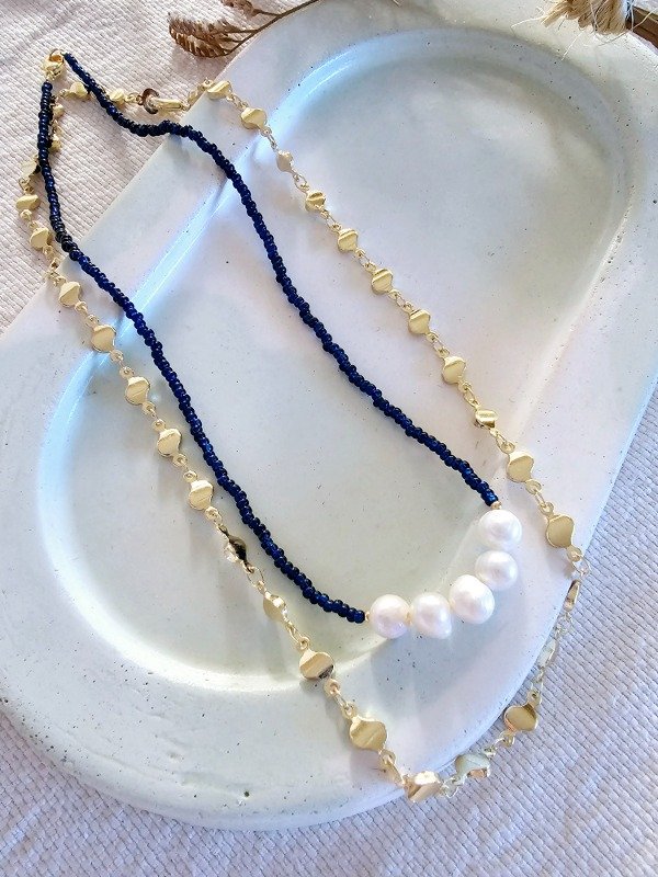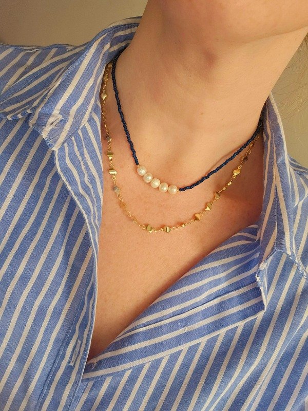 Medida 40 cm, este collar fue pensado para usarlo a la base del cuello y hacer layering con otros collares