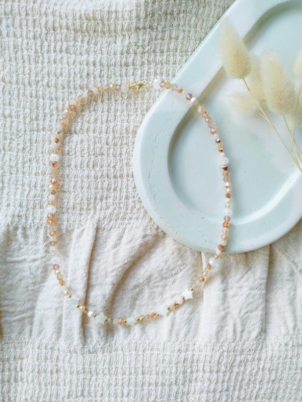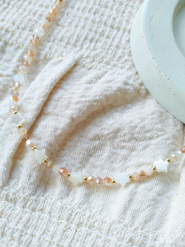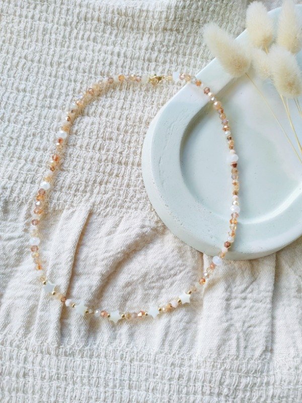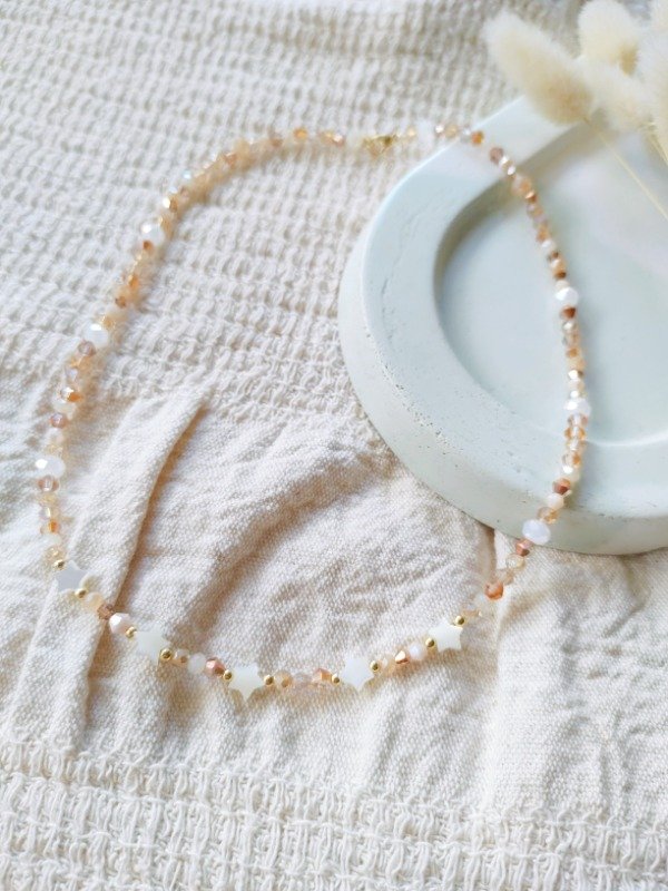 Collar con cristal de roca, dijes de estrellas de nácar y terminaciones en oro laminado