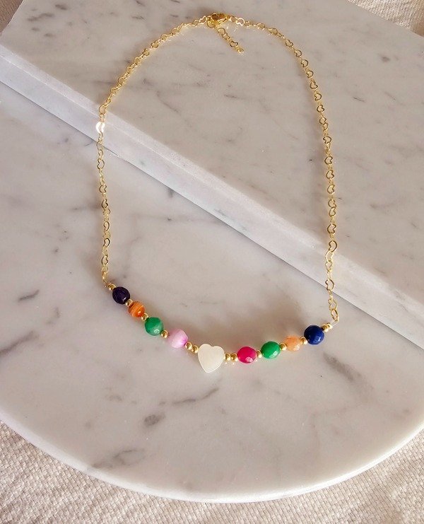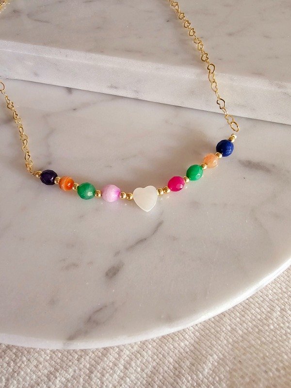 Collar con piedras agathas naturales (los colores pueden variar), corazón de nácar, cadena con mini corazones y fornituras de oro laminado