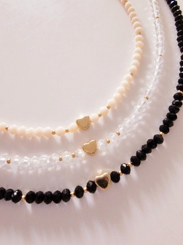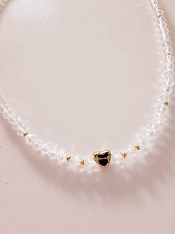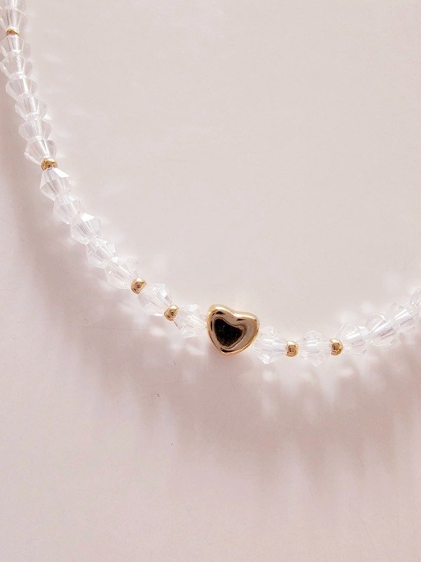 Collar con cristal de roca, dije de corazón pelotitas y terminaciones en oro laminado, el dije del final puede variar