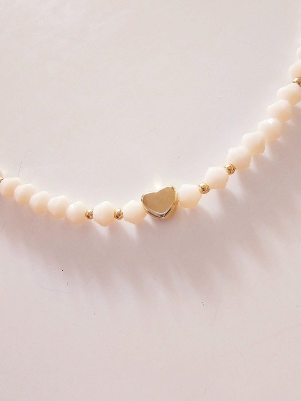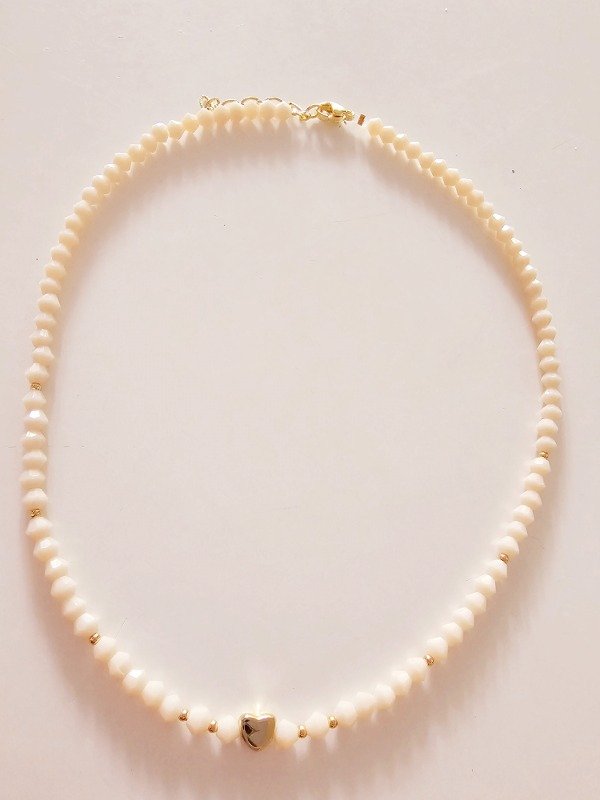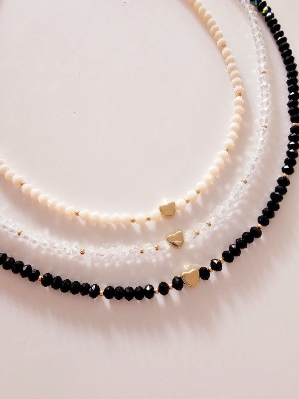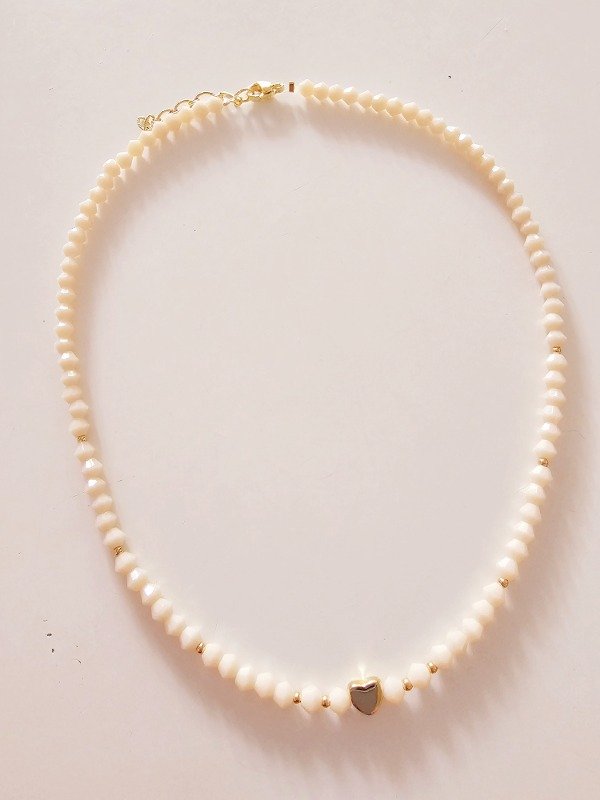 Collar con cristal de roca, dije de corazón pelotitas y terminaciones en oro laminado, el dije del final puede variar