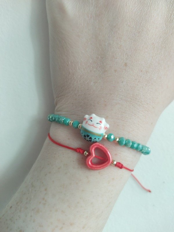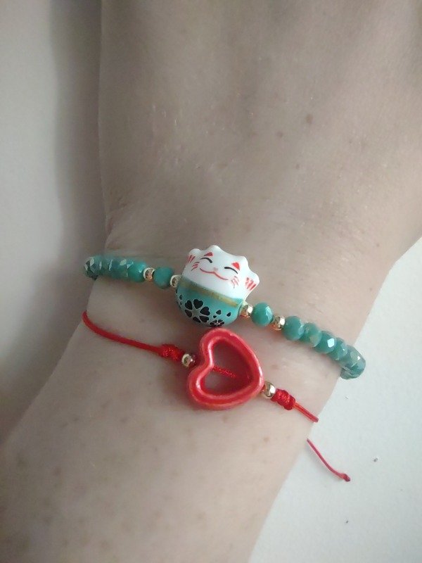 Pulsera elastizada con cristales de roca, pelotitas de oro laminado y dije de cerámica esmaltada