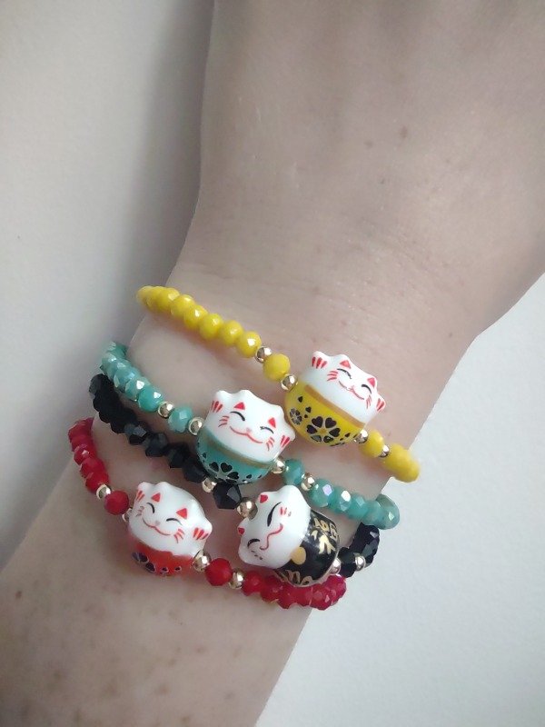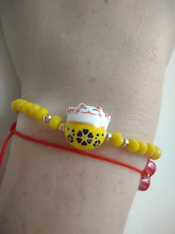 Pulsera elastizada con cristales de roca, pelotitas de oro laminado y dije de cerámica esmaltada