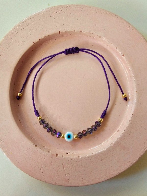 Pulsera con ojo turco de vidrio, cristales de roca y pelotitas de oro laminado con nudo regulable