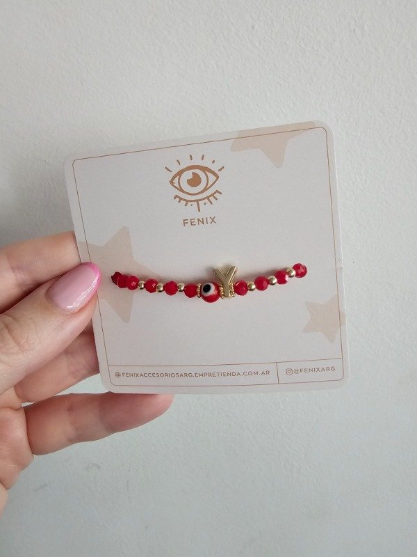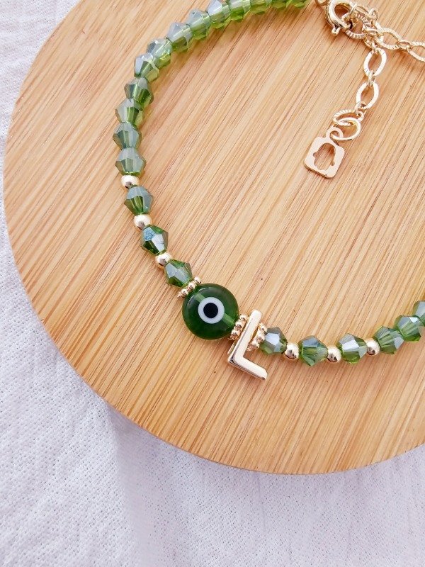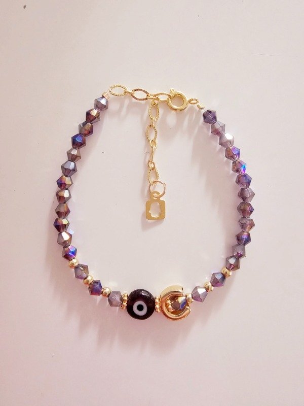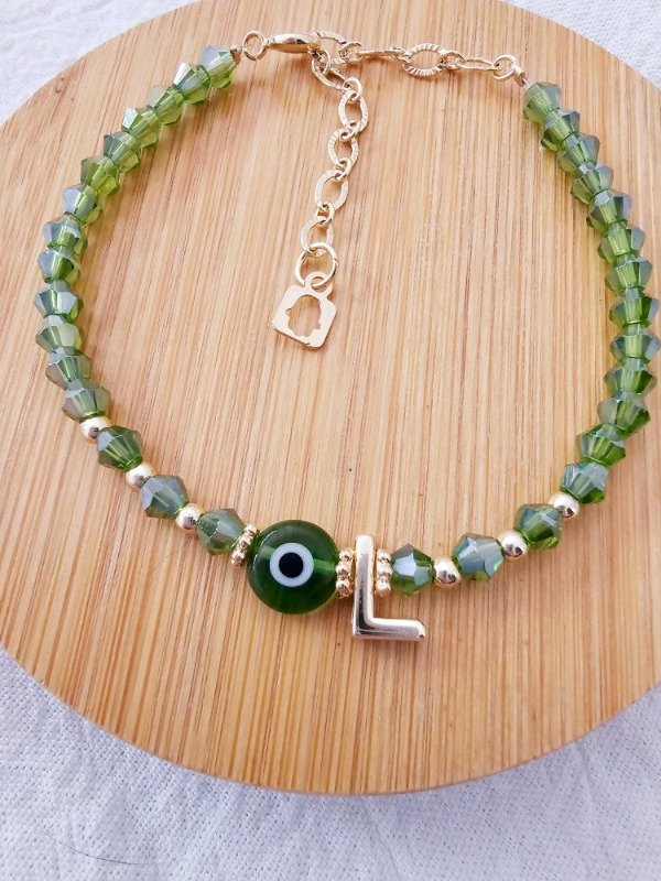 Pulsera con cristales de roca, ojo turco de vidrio a tono de los cristales, letra y fornituras de oro laminado