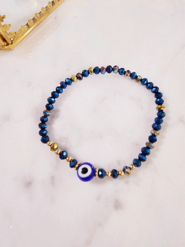 Pulsera con cristales de roca elastizada con ojo turco de vidrio a tono y fornituras en oro laminado
