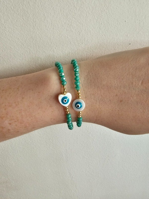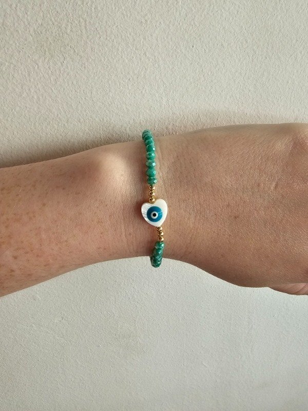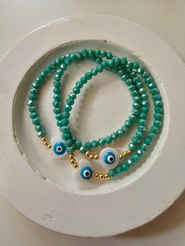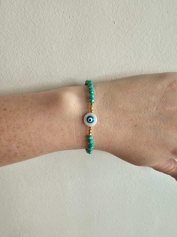 Pulsera elastizada con cristales de roca, pelotitas de oro laminado y dije de nácar con ojo turco esmaltado